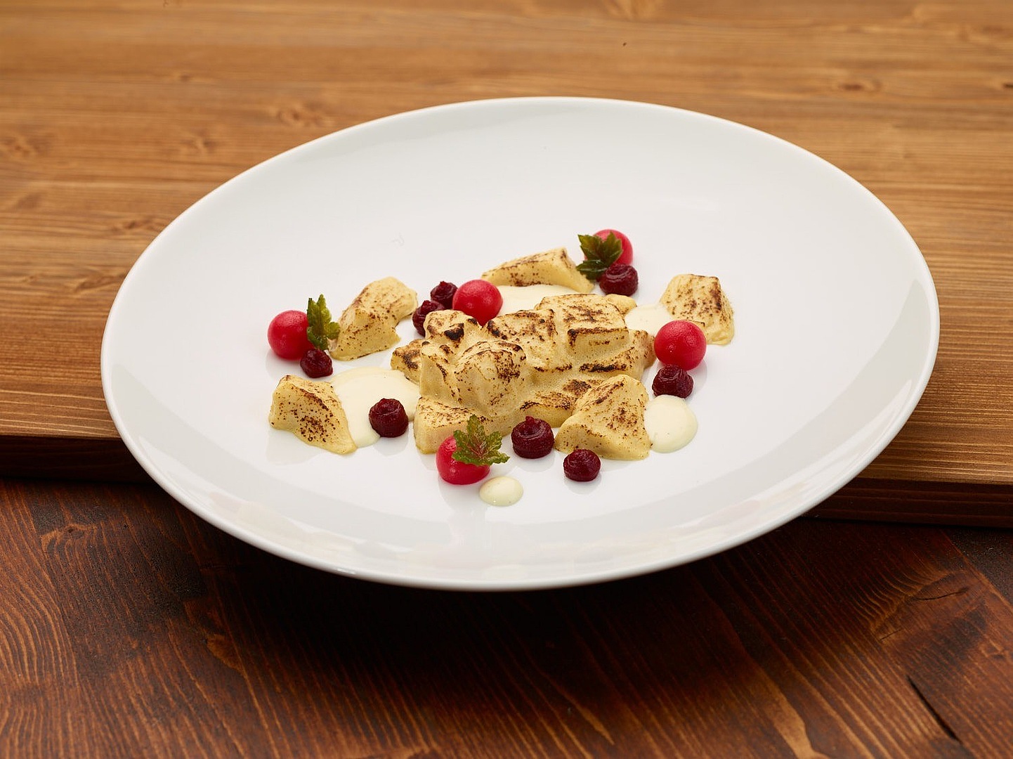 Der Kaiserschmarrn, serviert mit Kirschen und Vanillesauce, ist das perfekte Dessert für jeden Anlass. Die Komposition aus Säure und Süsse harmoniert und schmeckt garantiert jedem.